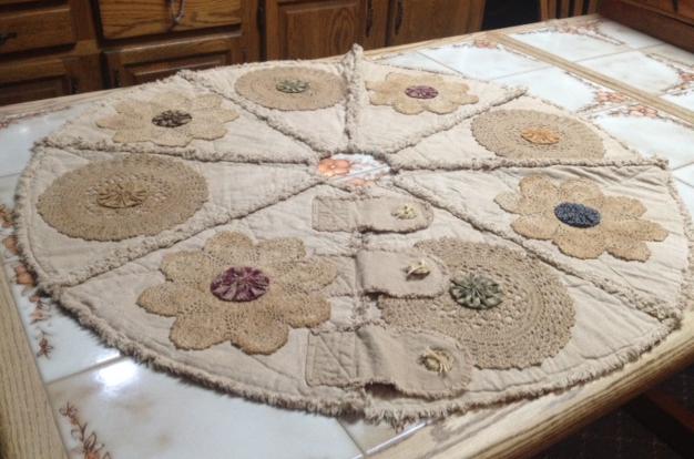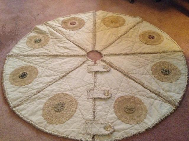 Tea Stained Osnburg Muslin Tree Skirt with Button Tabs and Doilies and YoYo's These tabs facilitate placing the skirt around the tree after it is up.