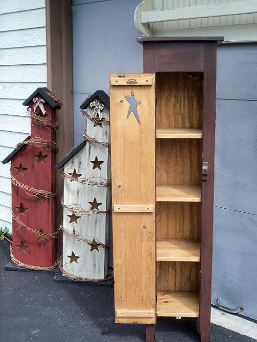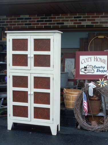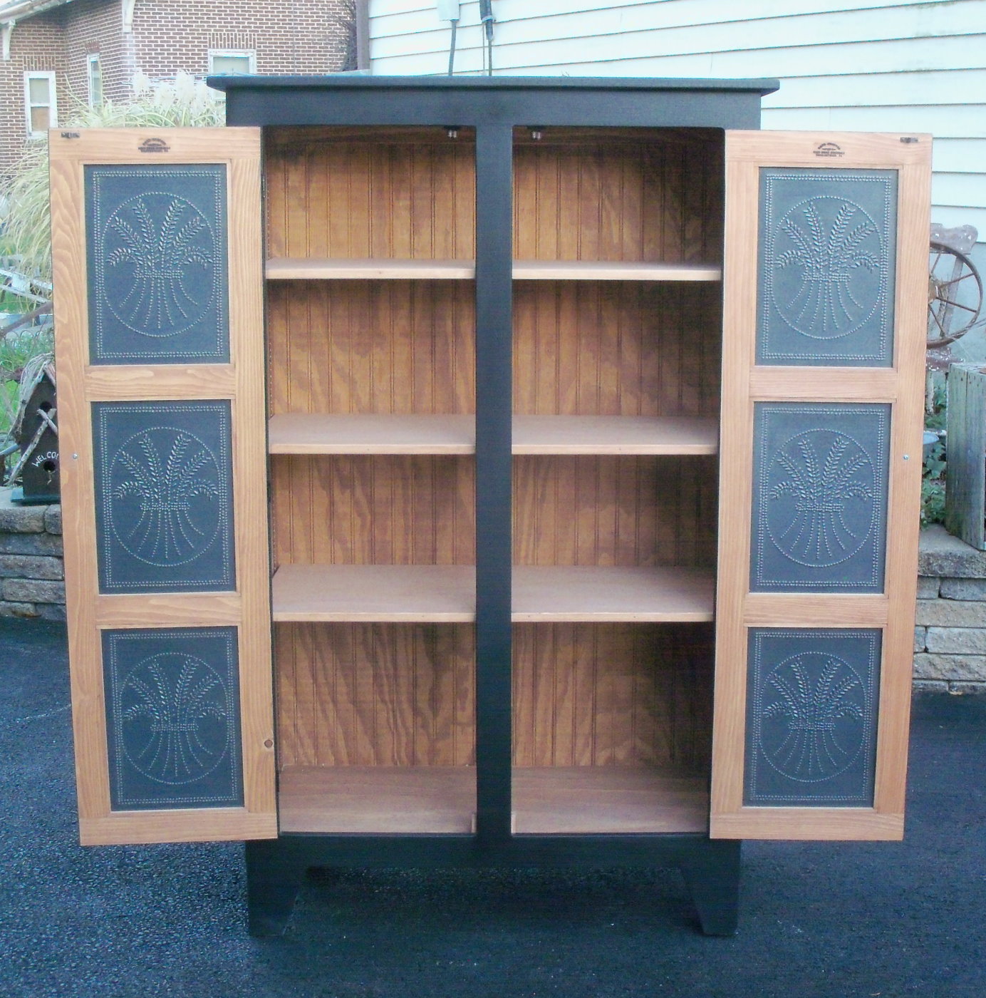 2 T in pie safe This Pie safe was designed to have more storage room for larger items. Available Punched Tin Panels can be viewed by following this link: Cabinet measures: